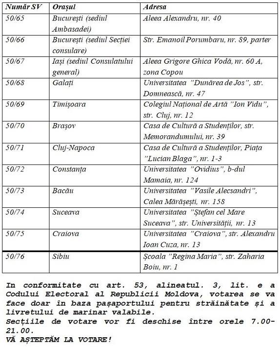 - București, nr. secției de votare: 50/65 (or. Bucureşti (sediul misiunii) 762432, Bucureşti, Aleea Alexandru nr.40, sector, 1, Tel: (+4021) 230 04 74, 231 32 07; 231 07 32)