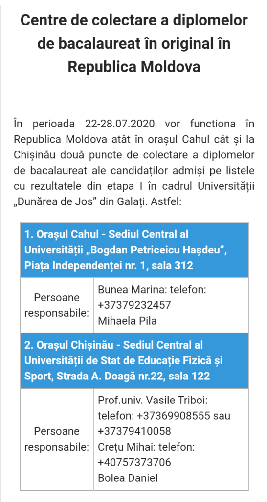 În perioada 22-28.07.2020 vor functiona în Republica Moldova atât în orașul Cahul cât și la Chișinău două puncte de colectare a diplomelor de bacalaureat ale candidaților admiși pe listele cu rezultatele din etapa I în cadrul Universității „Dunărea de Jos” din Galați. Astfel: